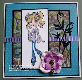 Joy used the Lil' Lolita's Willow. She used her pretty DP from Kaiser Craft-Lilac Avenue, pink crocheted ribbon, some flowers & a stick pin -cream. She colored her image with her copic pens and used her fleur de lis nestie to finish off her card.