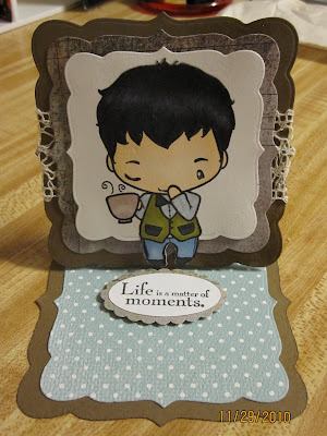 She decided to use the Cafe Ian from TGF for her image on her easel card. She also used some Basic Grey - Olivia DP and her favorite crocheted ribbon in ivory. Added a sentiment and used her labels fifteen nesties to create her card.