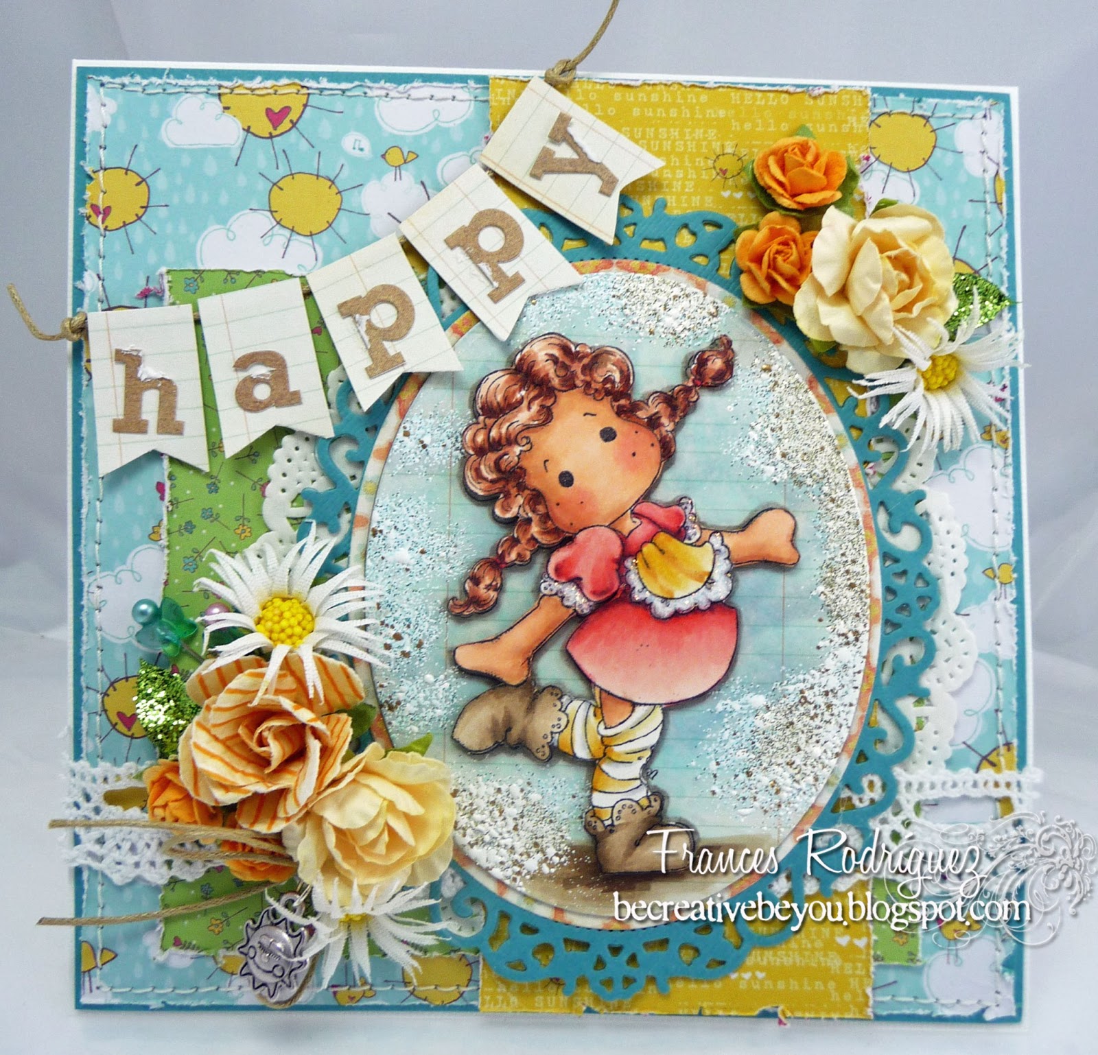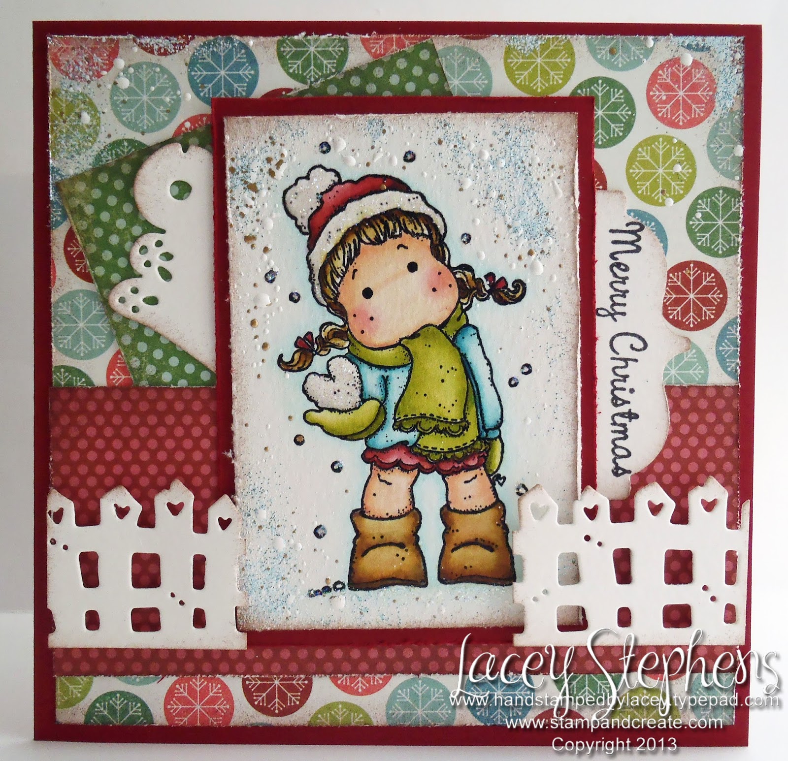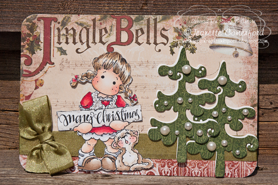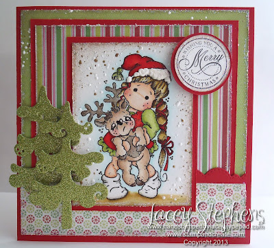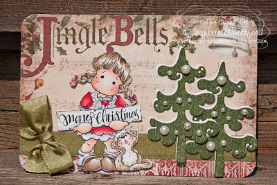 Tilda with Little Rudolf from Magnolia, papers from Silly Season from Kaisercraft, Scalloped Stitched Lace DooHickey, Spruce DooHickey, Christmas Circle Sentiments from Wild Rose Studio, Frantage, and Stickles.